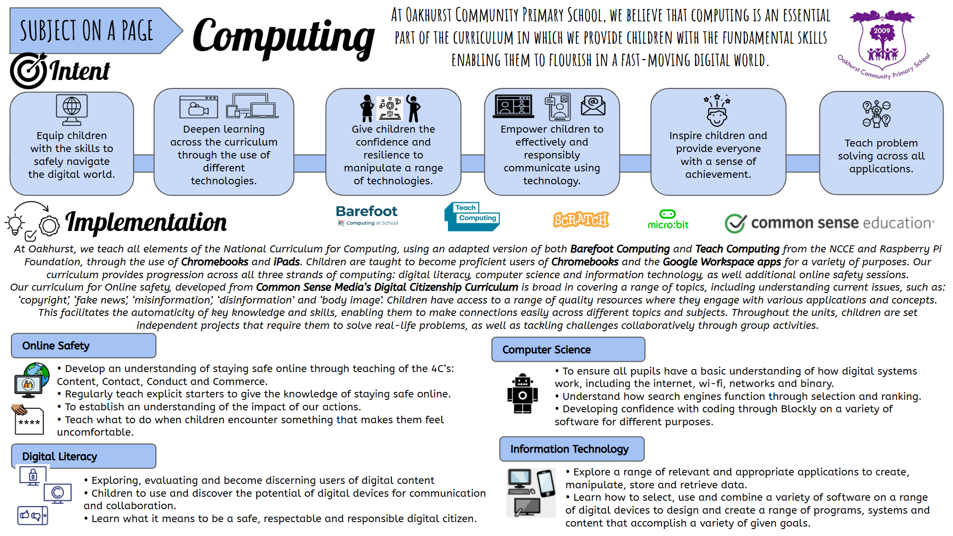 At Oakhurst Community Primary School, we always aim to be as inclusive as possible. To that end, parents and carers will find easily digestible documents that provide more detail about the individual subjects that compose our curriculum offer.
