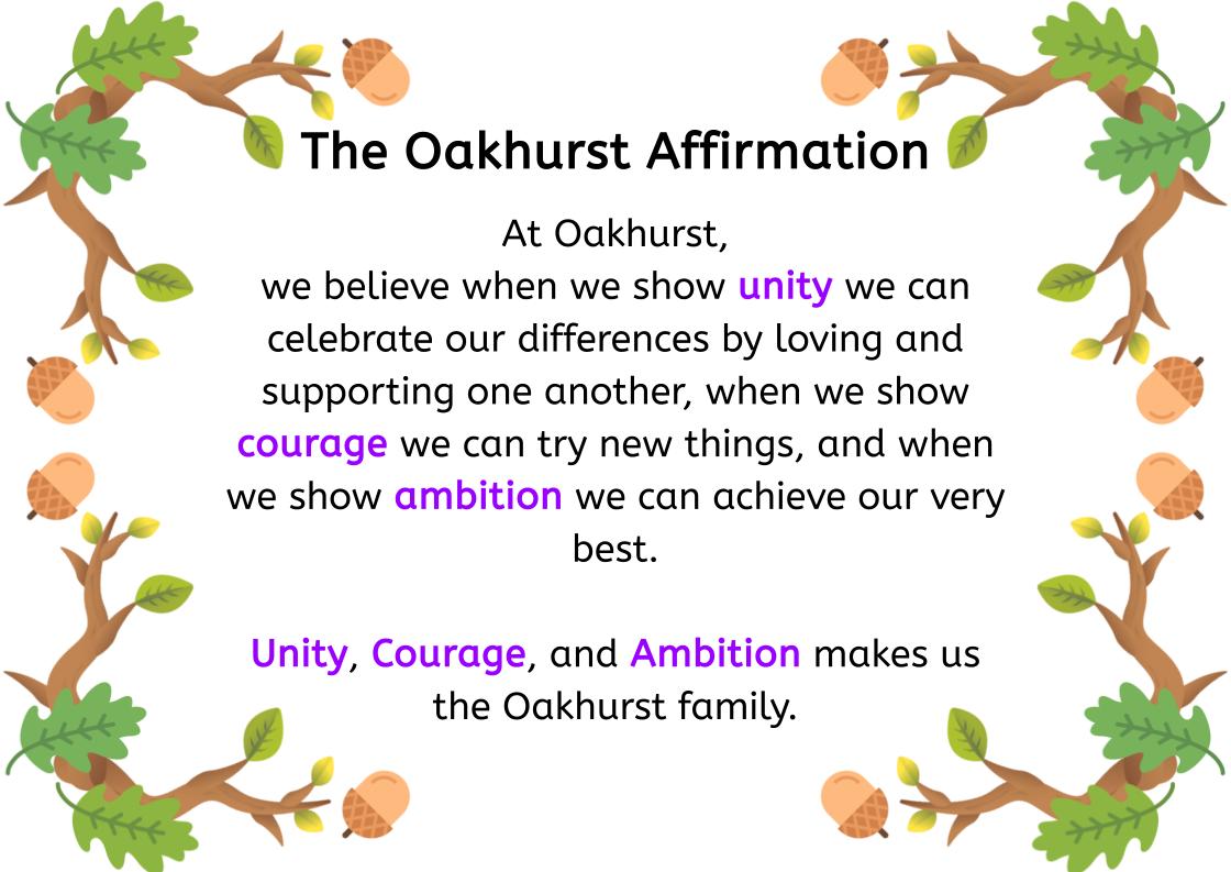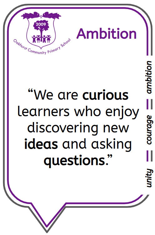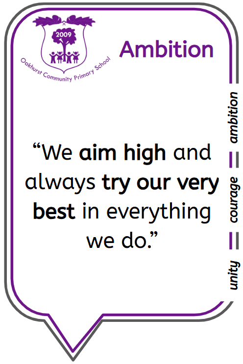 Ambition is the desire to do or achieve something. To achieve an ambition there must be hope, purpose, intent, and determination to succeed. Our Oakhurst curriculum is ambitious. It is based on the acquisition of knowledge and skills which are fundamental to learning and will enable children to be the best versions of themselves. We are ambitious for ourselves, but also for others. Our ambition gives us purpose and desire to create change in our society and the wider world. We encourage and nurture the aspirations of our pupils and staff ensuring that everyone can achieve their potential.