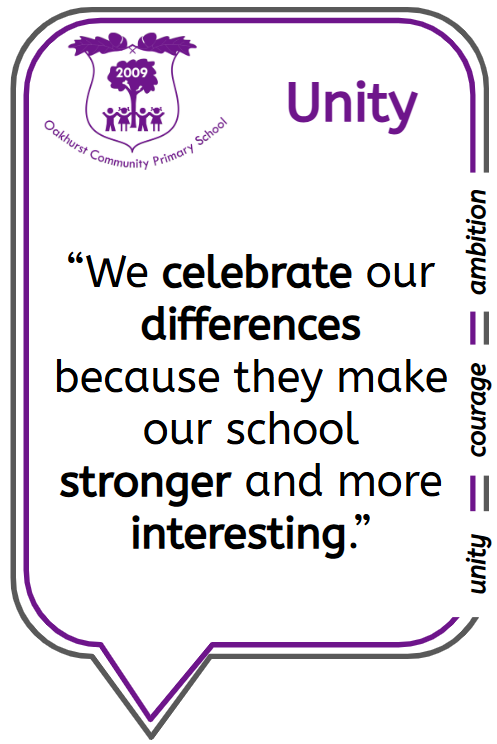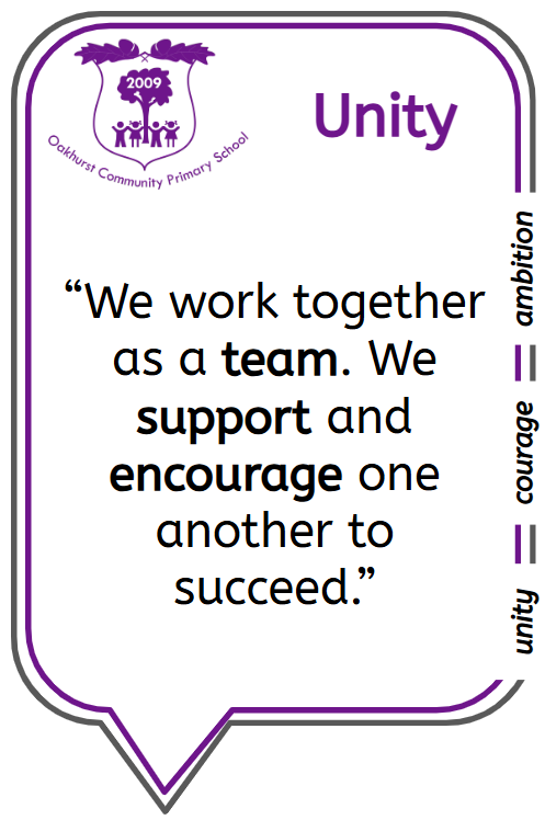 Unity is the state of being united or joined as a whole. At Oakhurst, we aim to build an environment in which the school community (pupils, staff, parents) works together, celebrating each others' differences, to become one team. We encourage everyone to work in harmony with one another, accepting and appreciating each other, cooperating on tasks and helping each other out. Our school is united as a community, and we join together for the benefit of all.